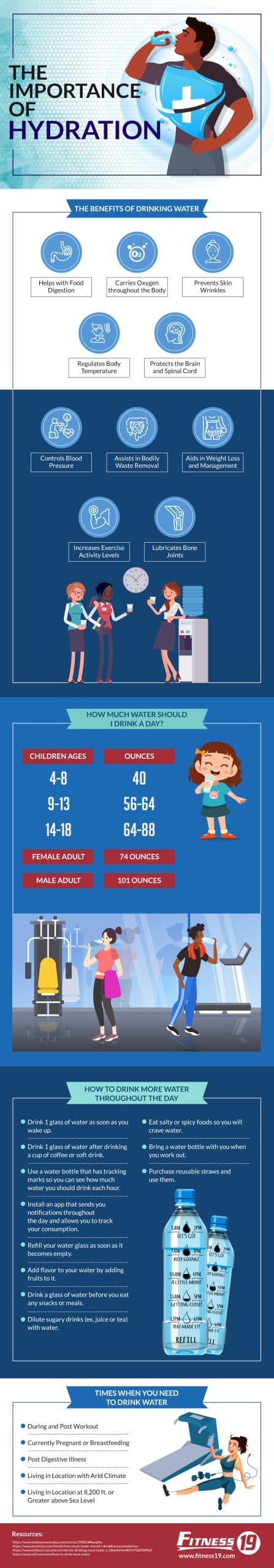 Staying hydrated is a crucial part of maintaining a healthy lifestyle. Hydration is important because it helps with food digestion, carries oxygen throughout the body, increases exercise activity levels, and aids in weight loss and management. How much water you need depends on your age and body type, but a general rule of thumb is 74 ounces for female adults and 101 ounces for male adults. To drink more water, you should use a water bottle with tracking on it and refill your water glass as soon as it is empty. Take time to learn about the importance of hydration and ways to stay hydrated.